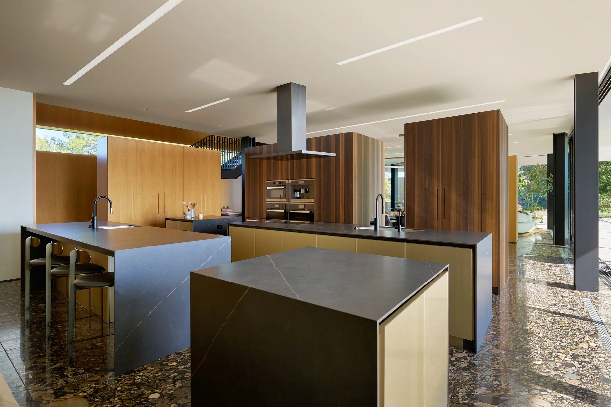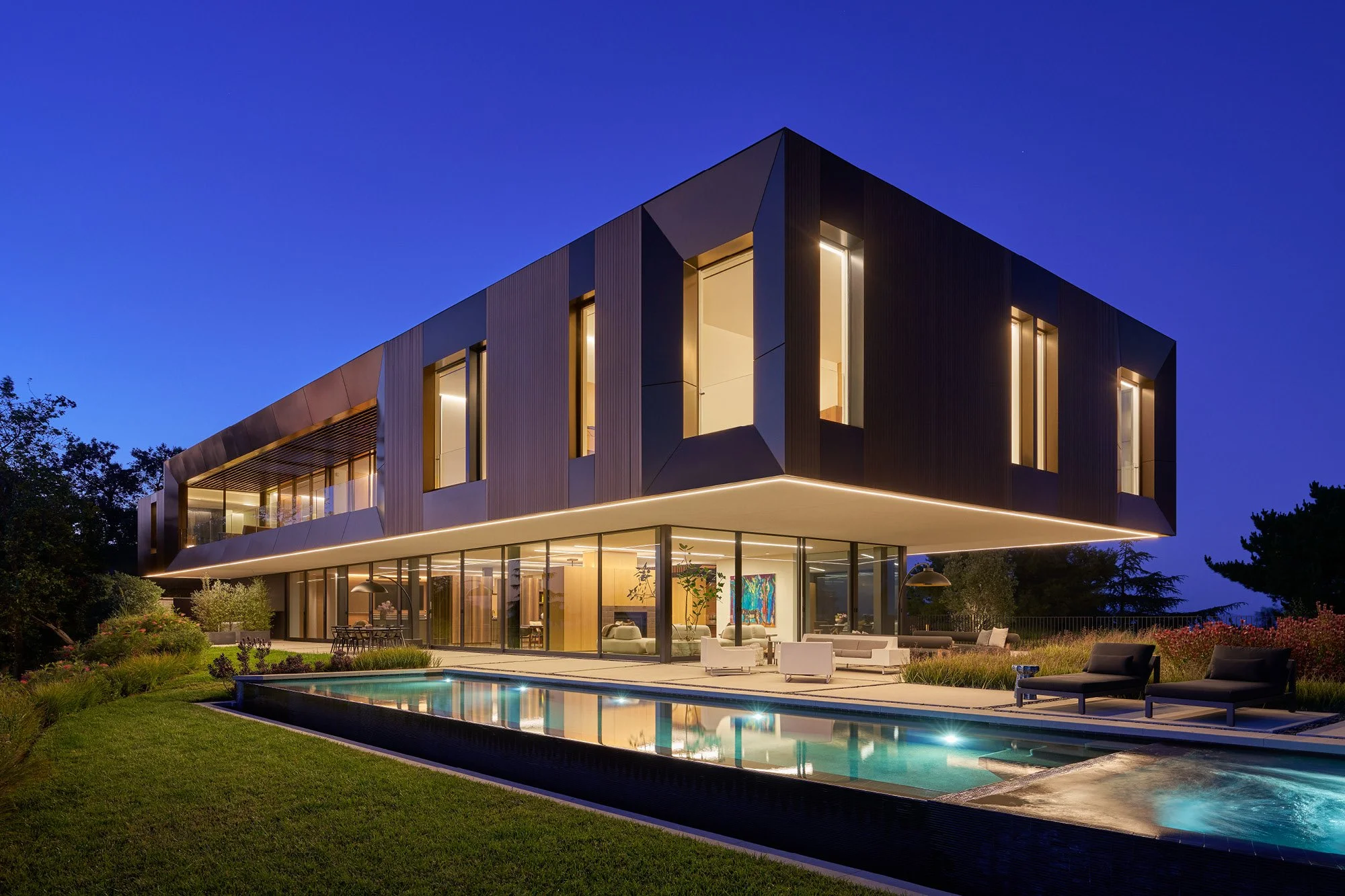 The 8,000 square-foot main residence and 2,500 square-foot guest house seem to float above the cities, embracing 360-degree views from every vantage point. NCA Studio assumed the project after initial design and partial permitting were completed, immediately navigating complex zoning issues, code requirements, and multi-disciplinary coordination necessary to deliver exquisite luxury and precise detailing.