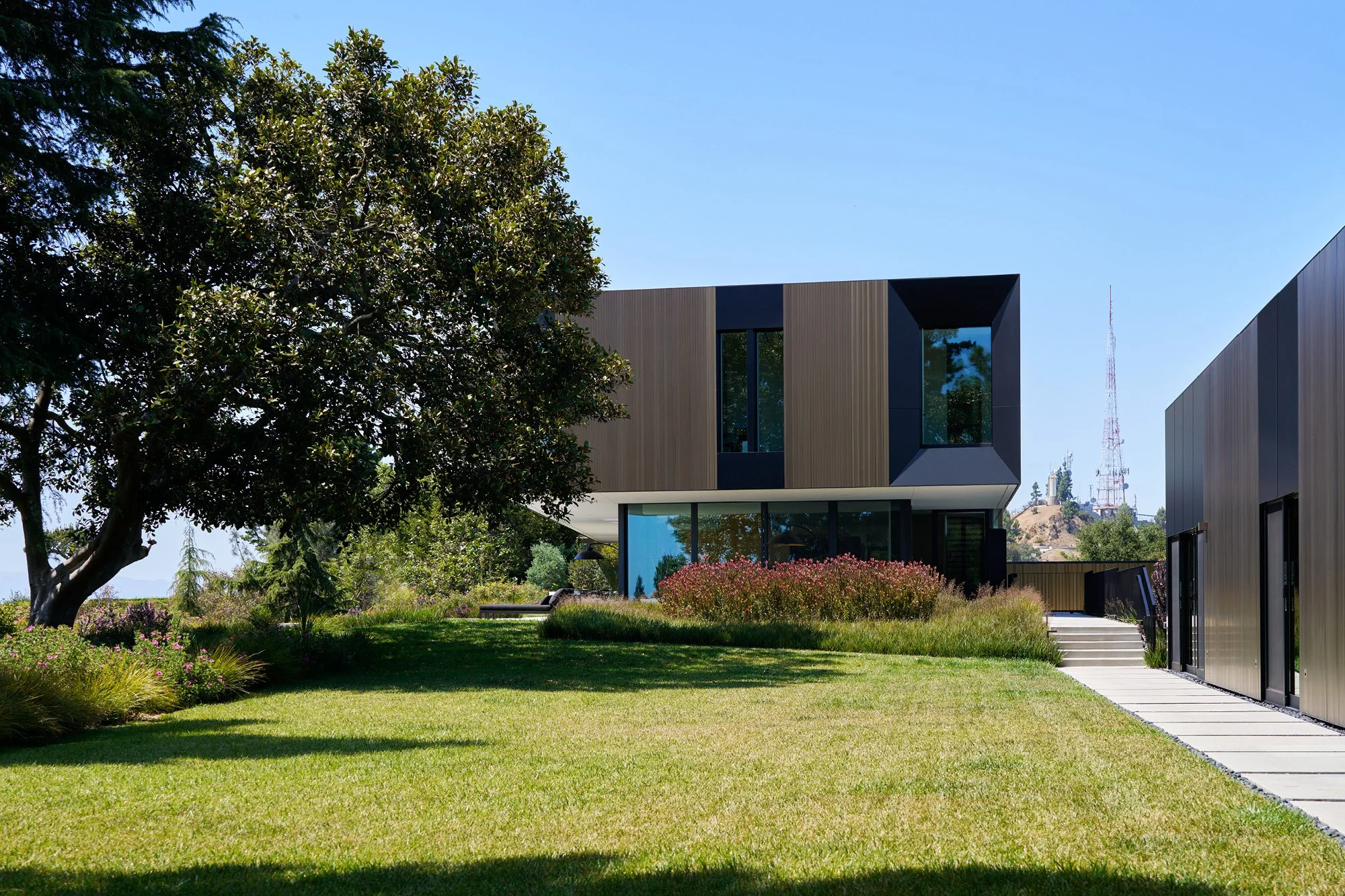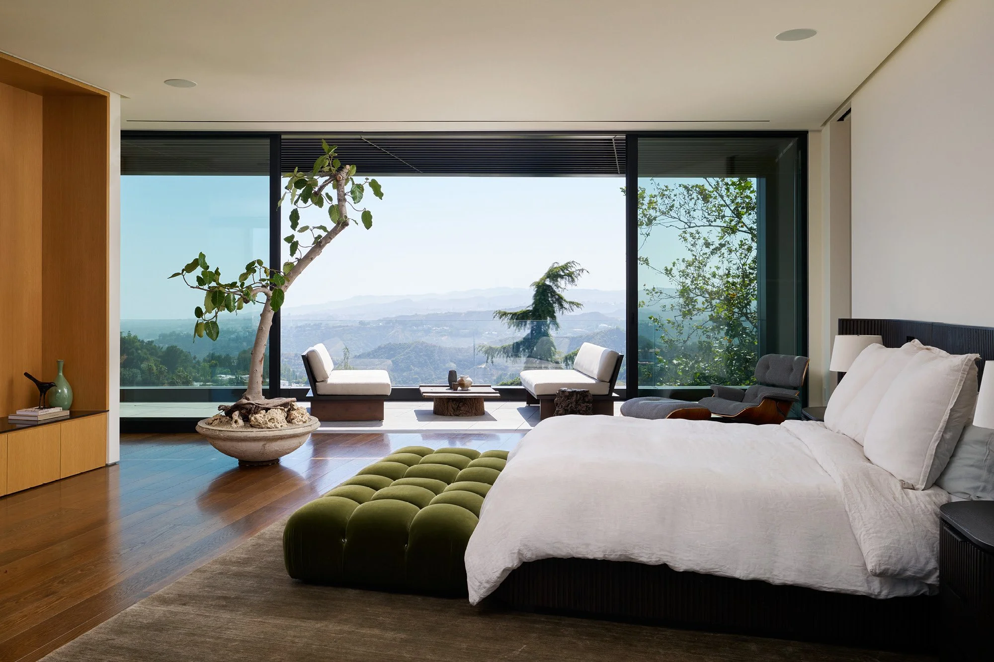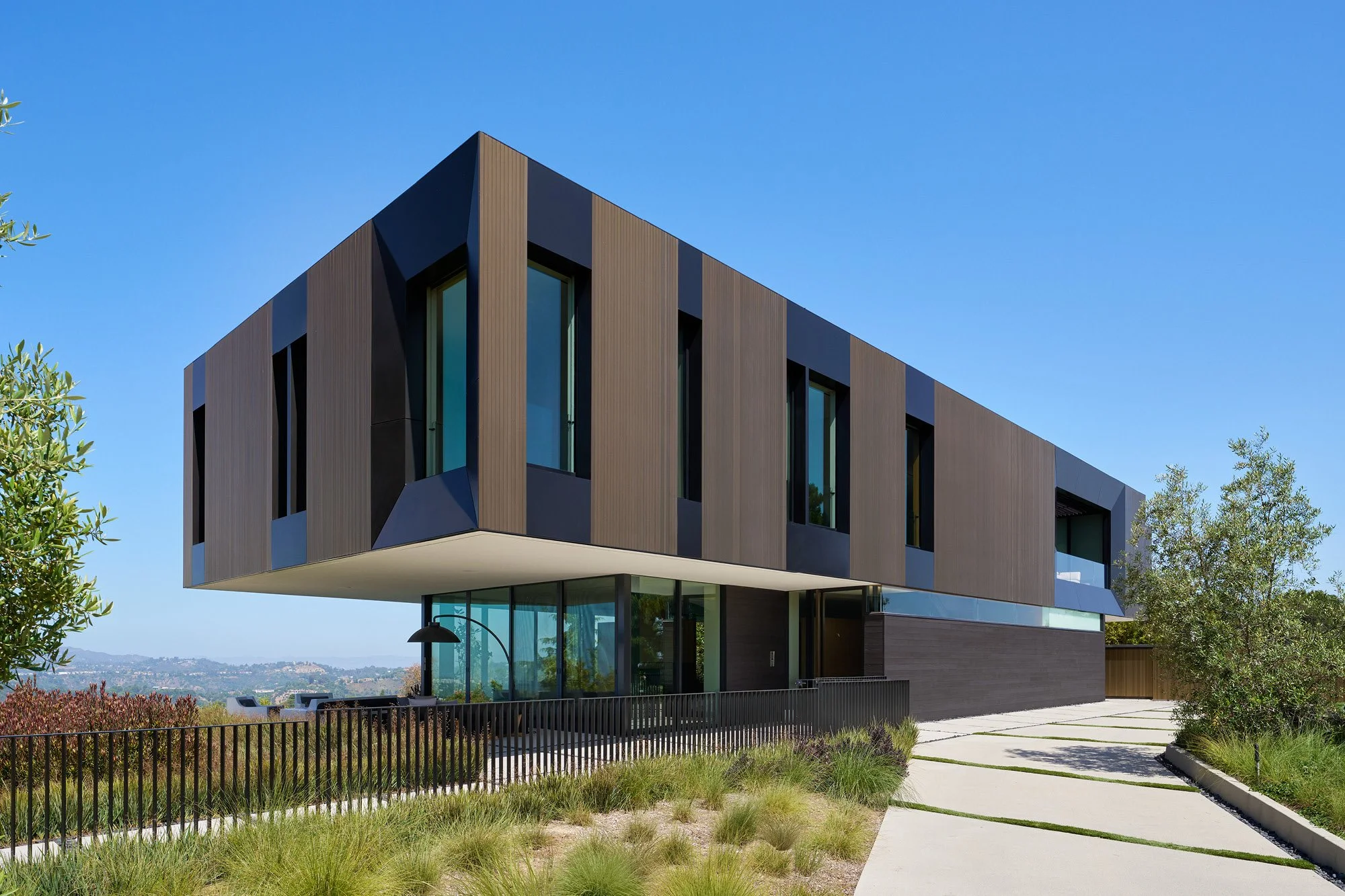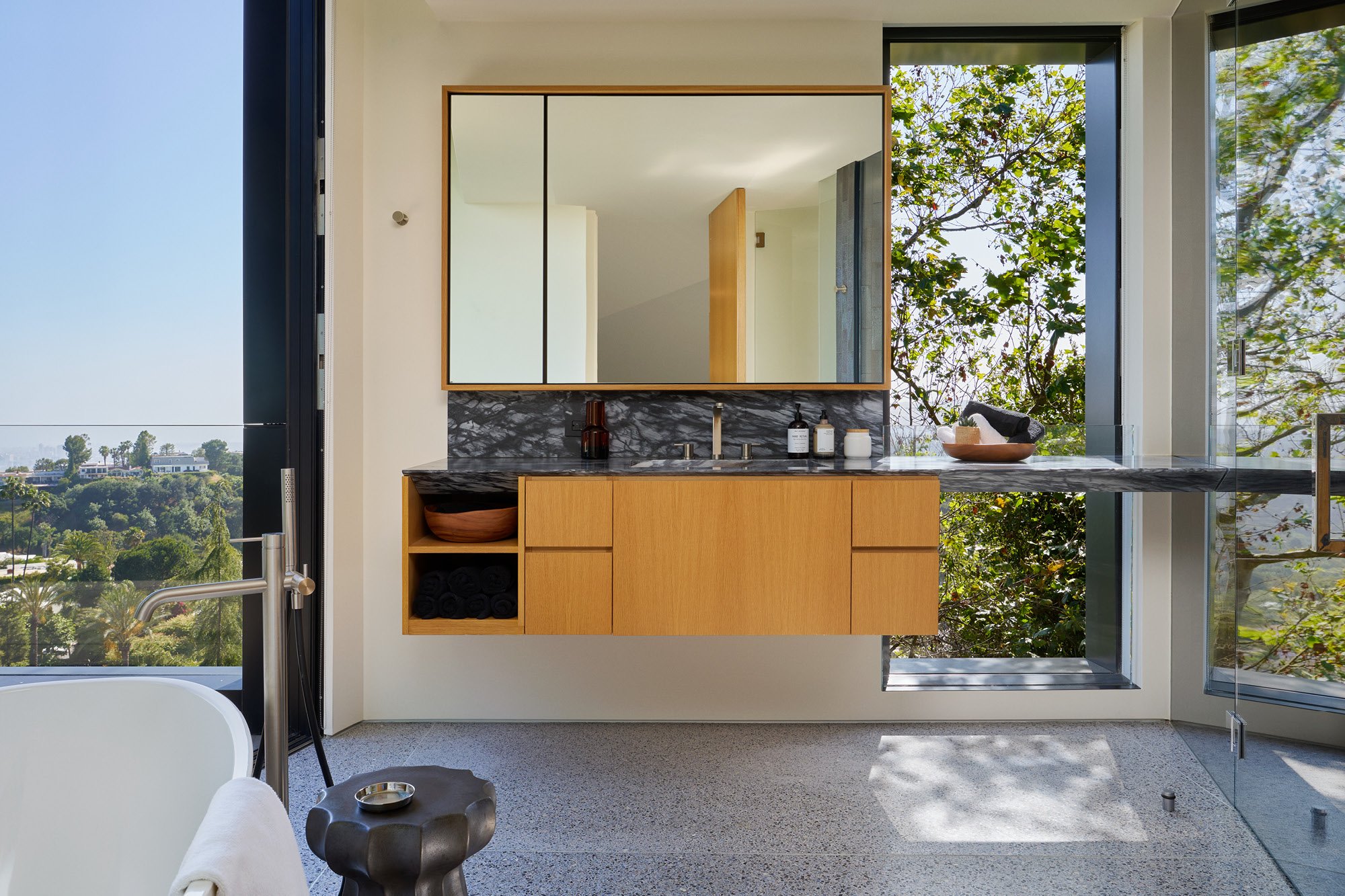 A delicate rhythm of heavy to light and dark to bright materials plays across this home's floating volumes, melding seamlessly with the natural surroundings. The residence sits on an extraordinary 2.3-acre property perched above both Los Angeles and Beverly Hills, with views spanning from the Hollywood Hills to downtown LA and the Pacific Ocean.