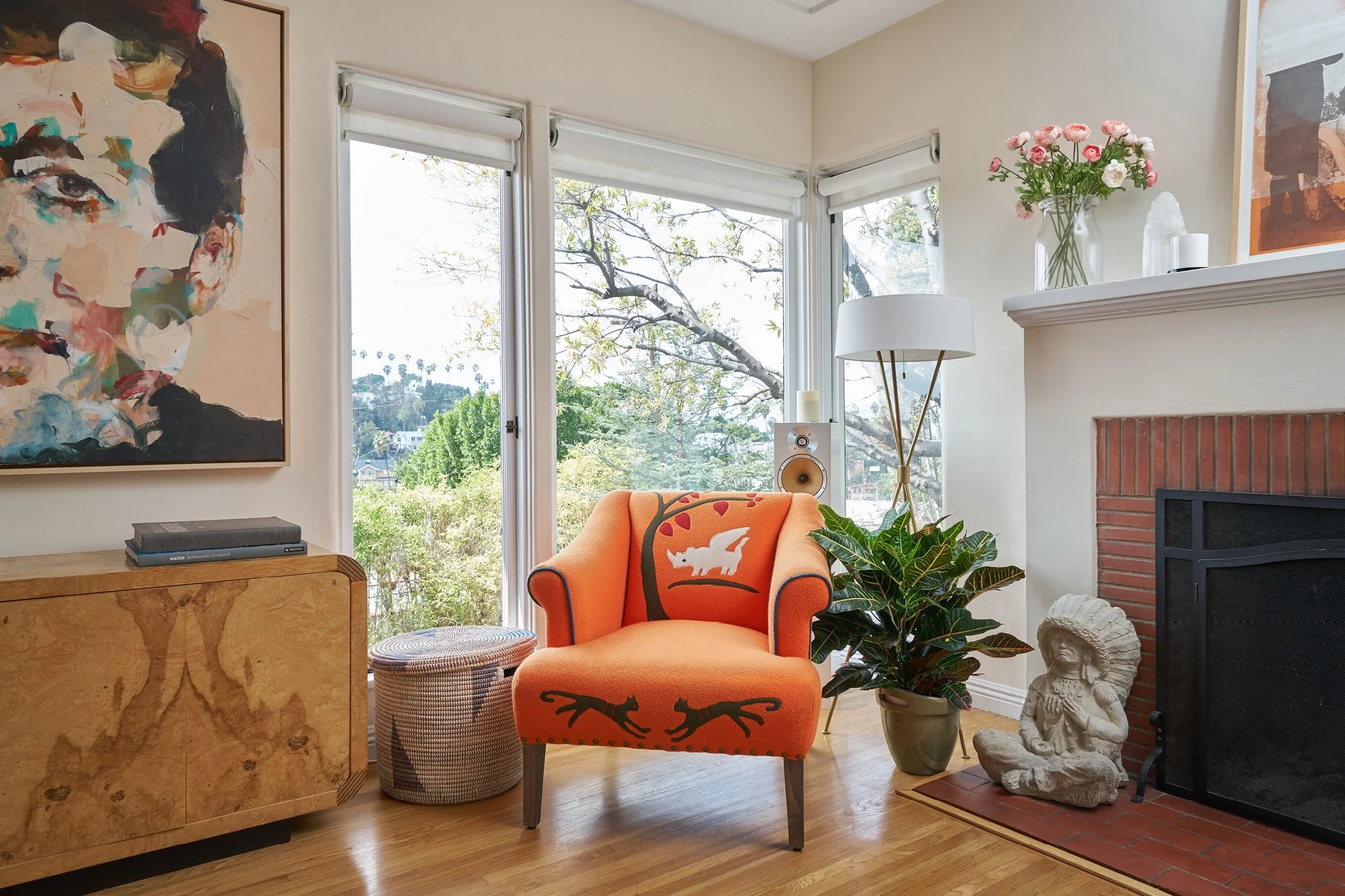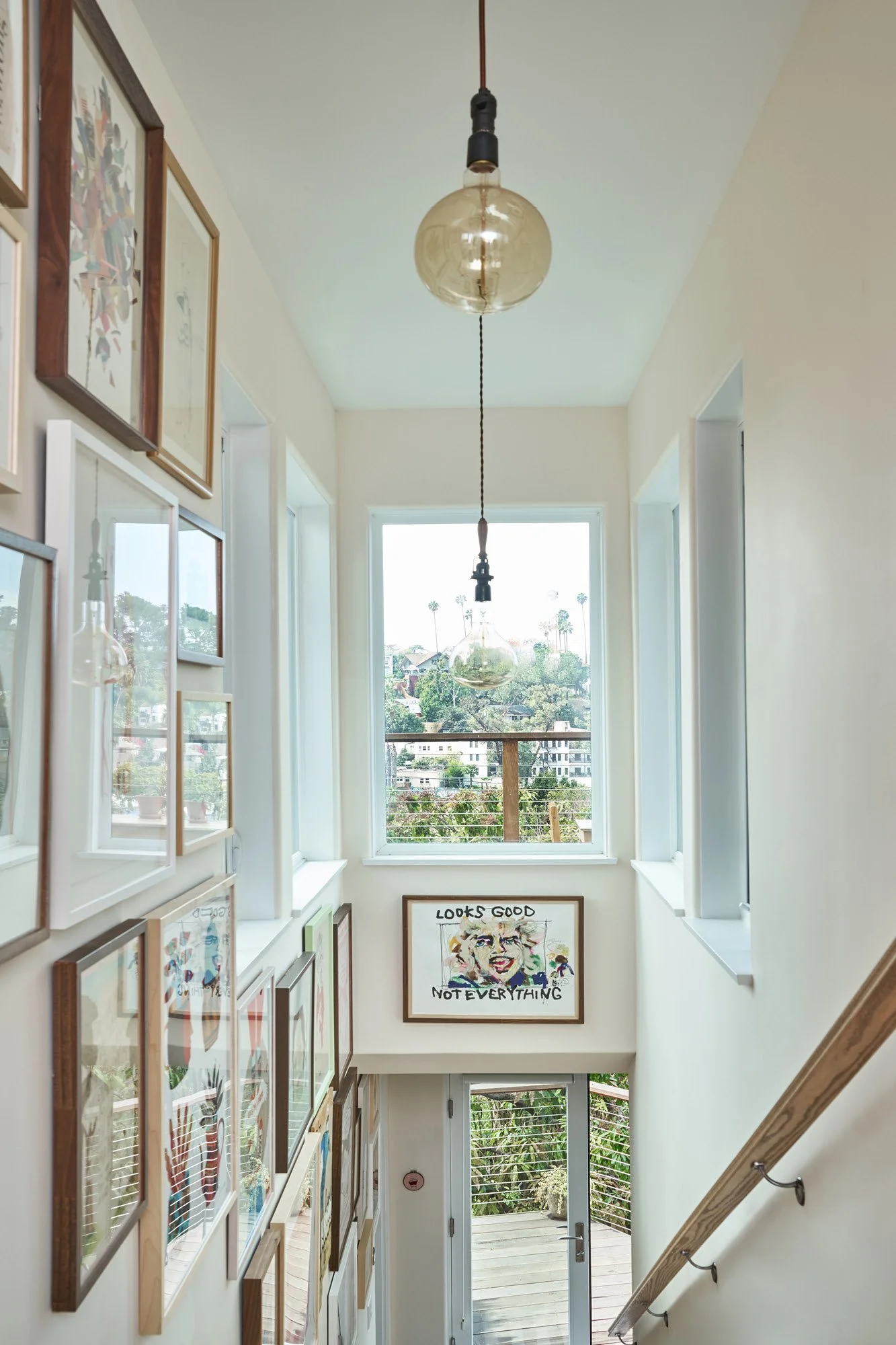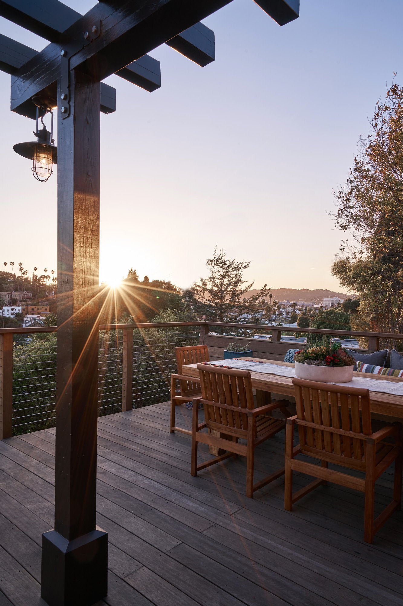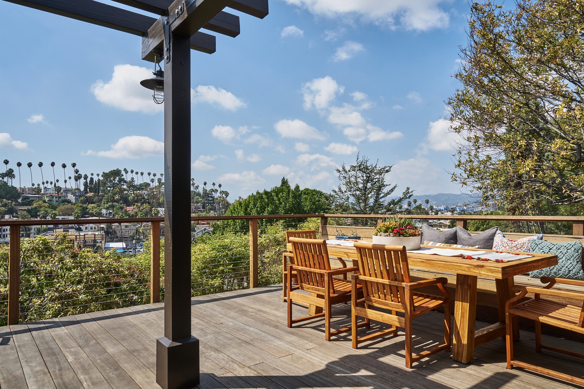 The home expanded through a lower-floor addition that tucks into the hillside beneath the existing structure. Cantilevered decks and private patios reach out over the slope, extending living space without adding significant square footage and capturing views of the Hollywood Hills. These outdoor spaces allow the couple to embrace Southern California's enviable climate and stunning landscape.