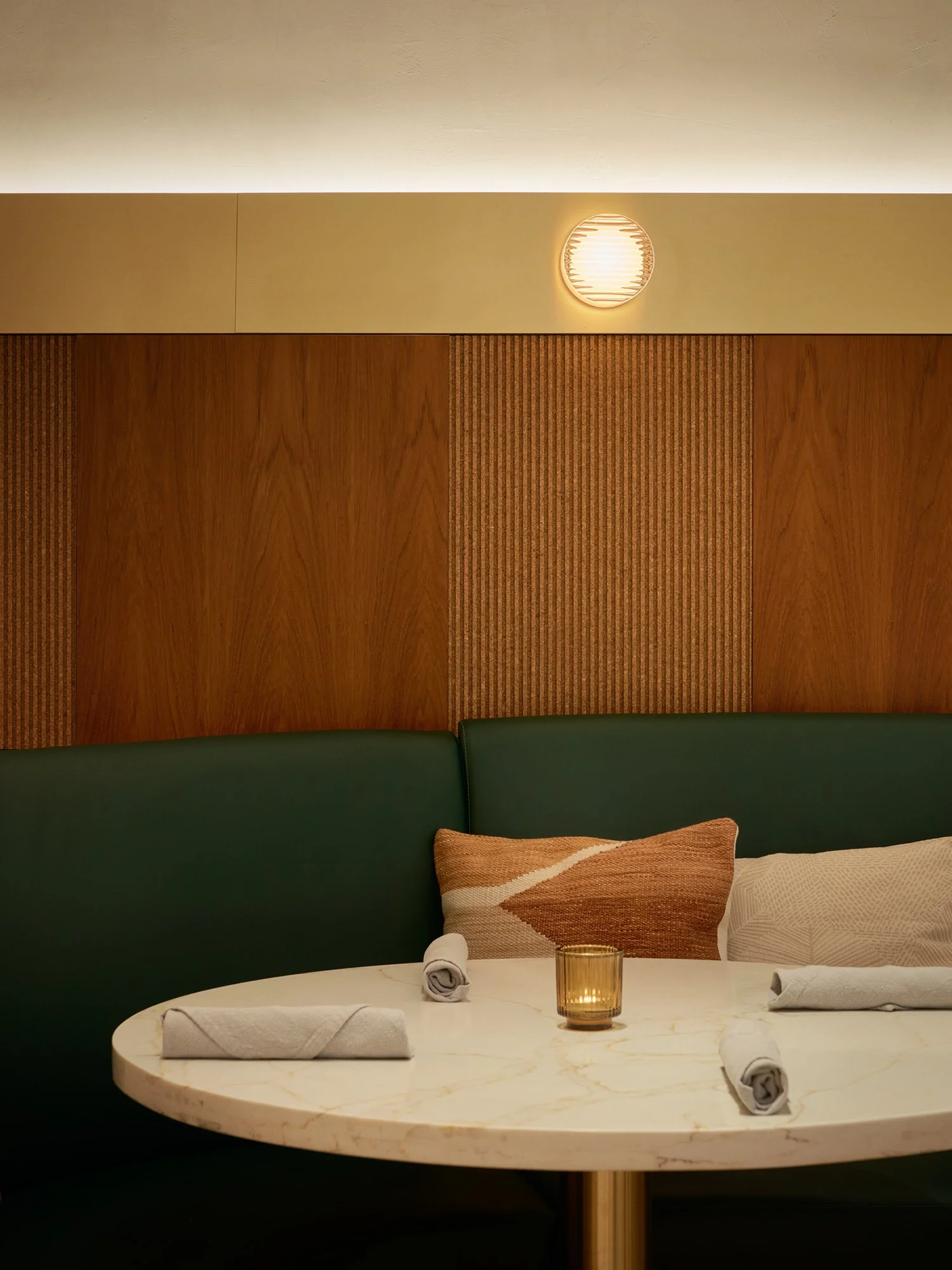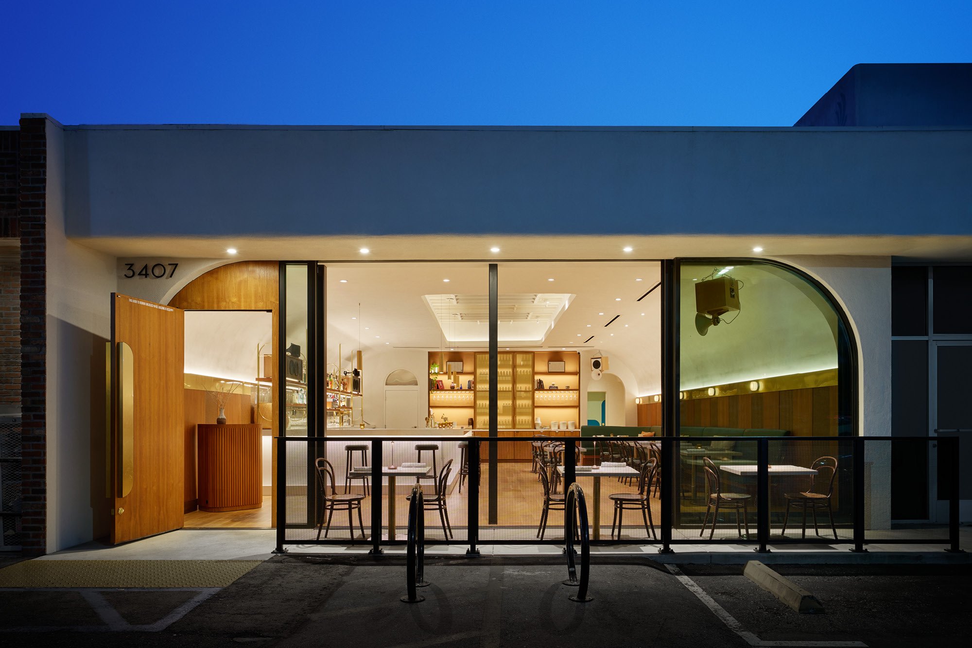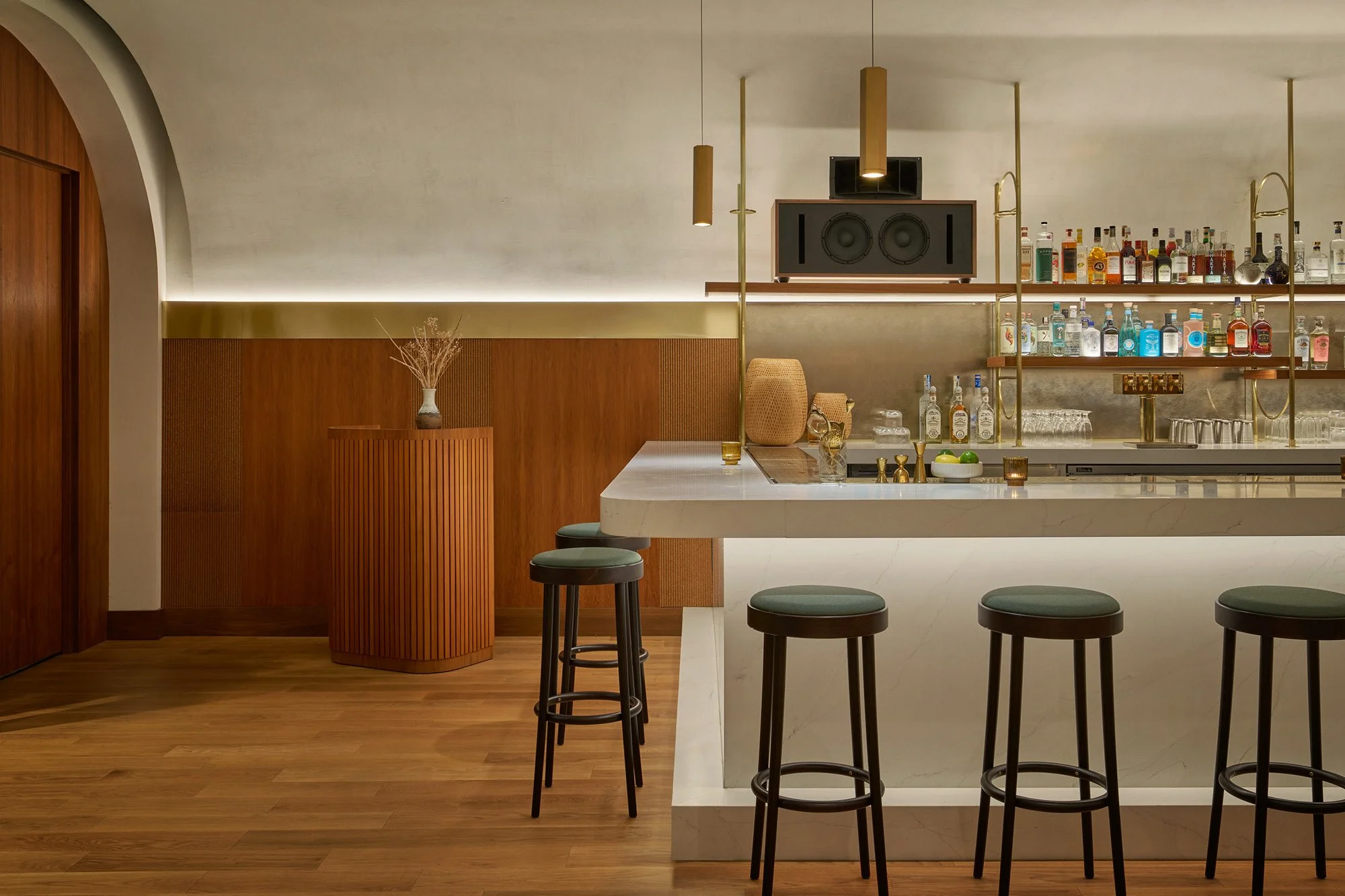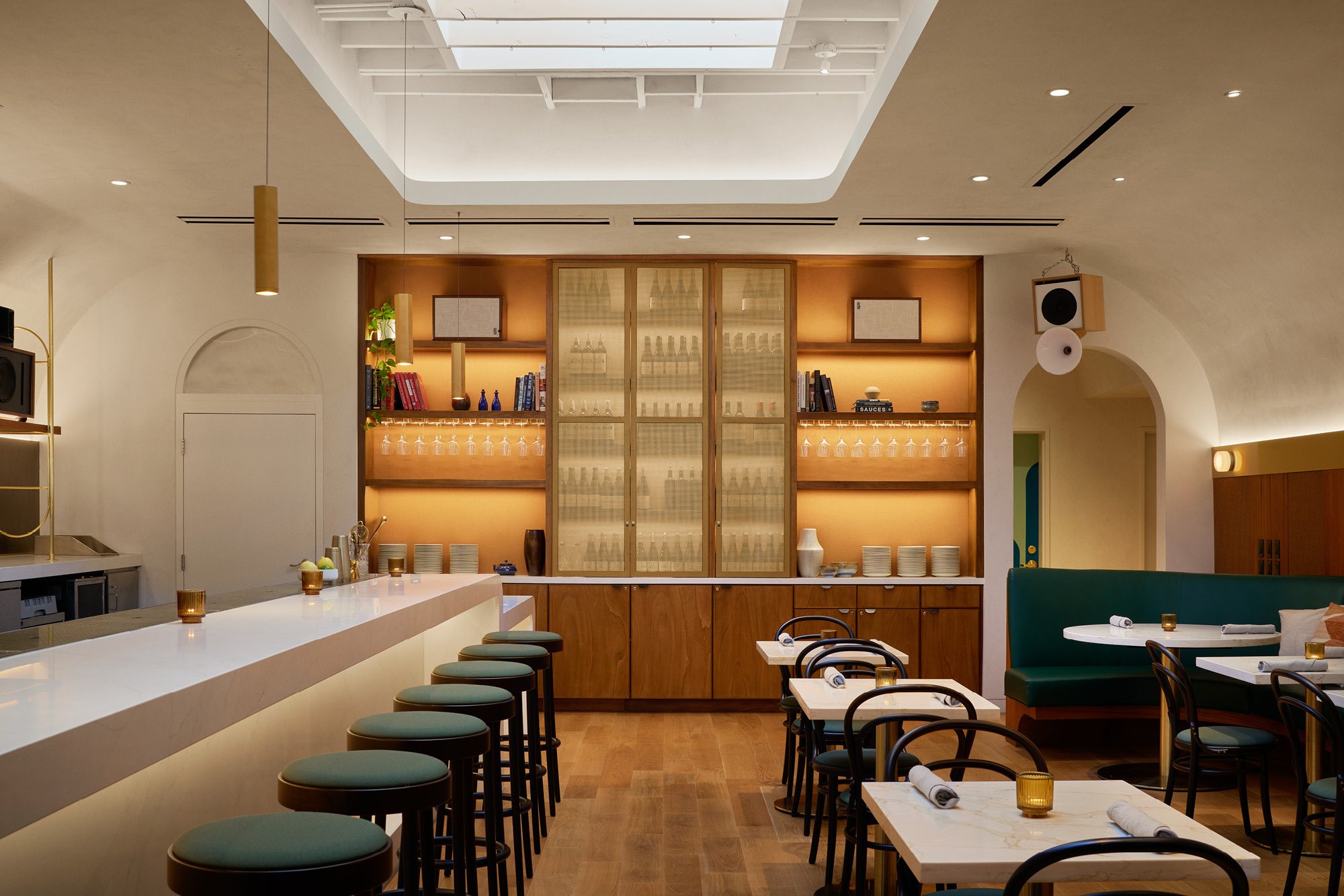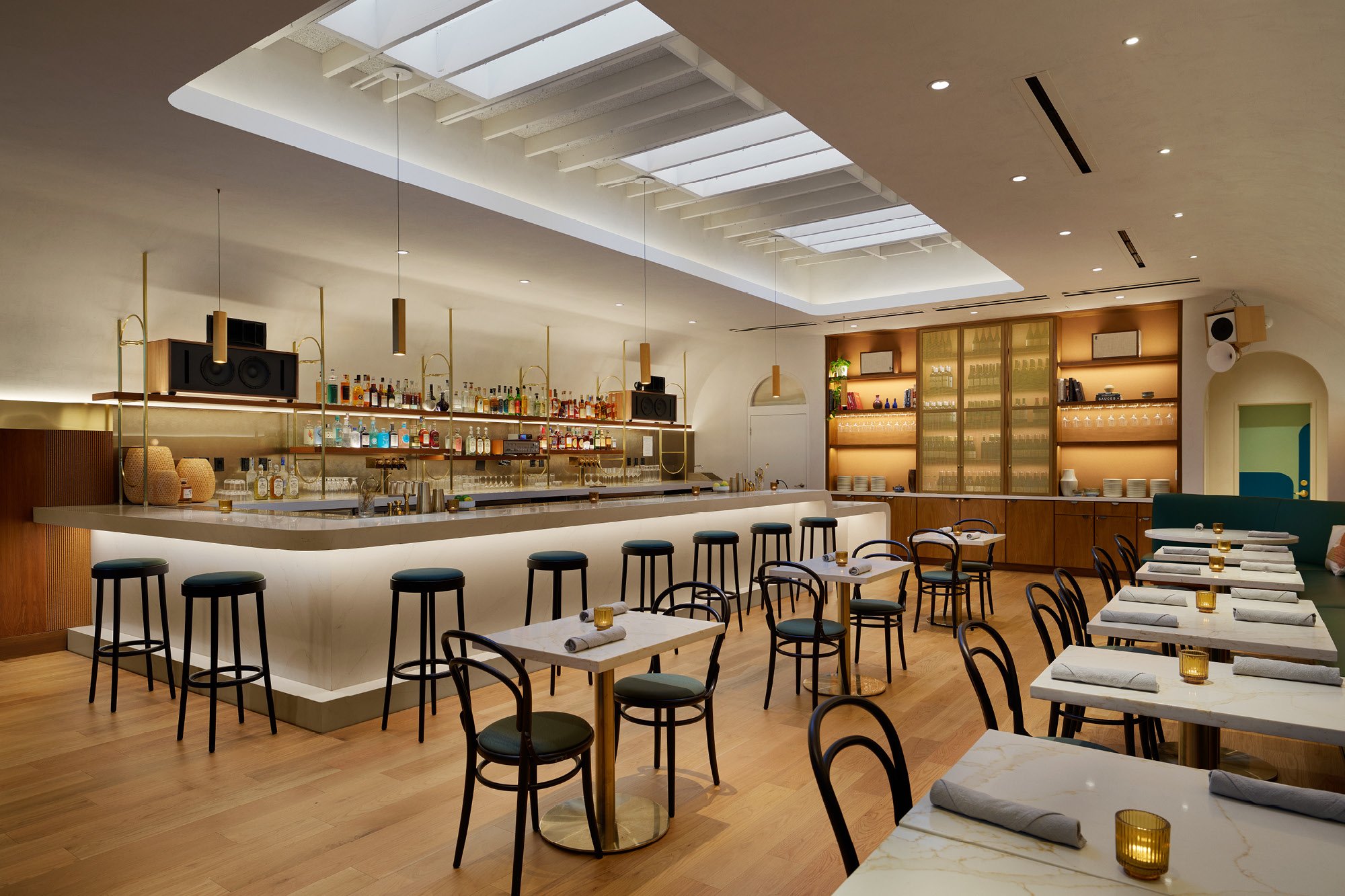 Warmth permeates every design decision. A soft ambient glow emanates from the custom bar and banquette seating, while carefully selected materials—brass, marble, wood, and cork—create sophisticated yet approachable Southern California hospitality. The palette feels both elevated and welcoming, establishing a sense of place that supports diverse gatherings from casual to formal.