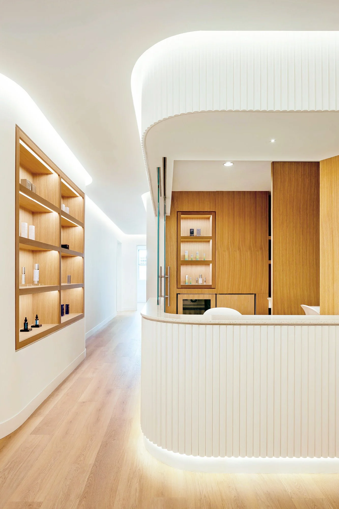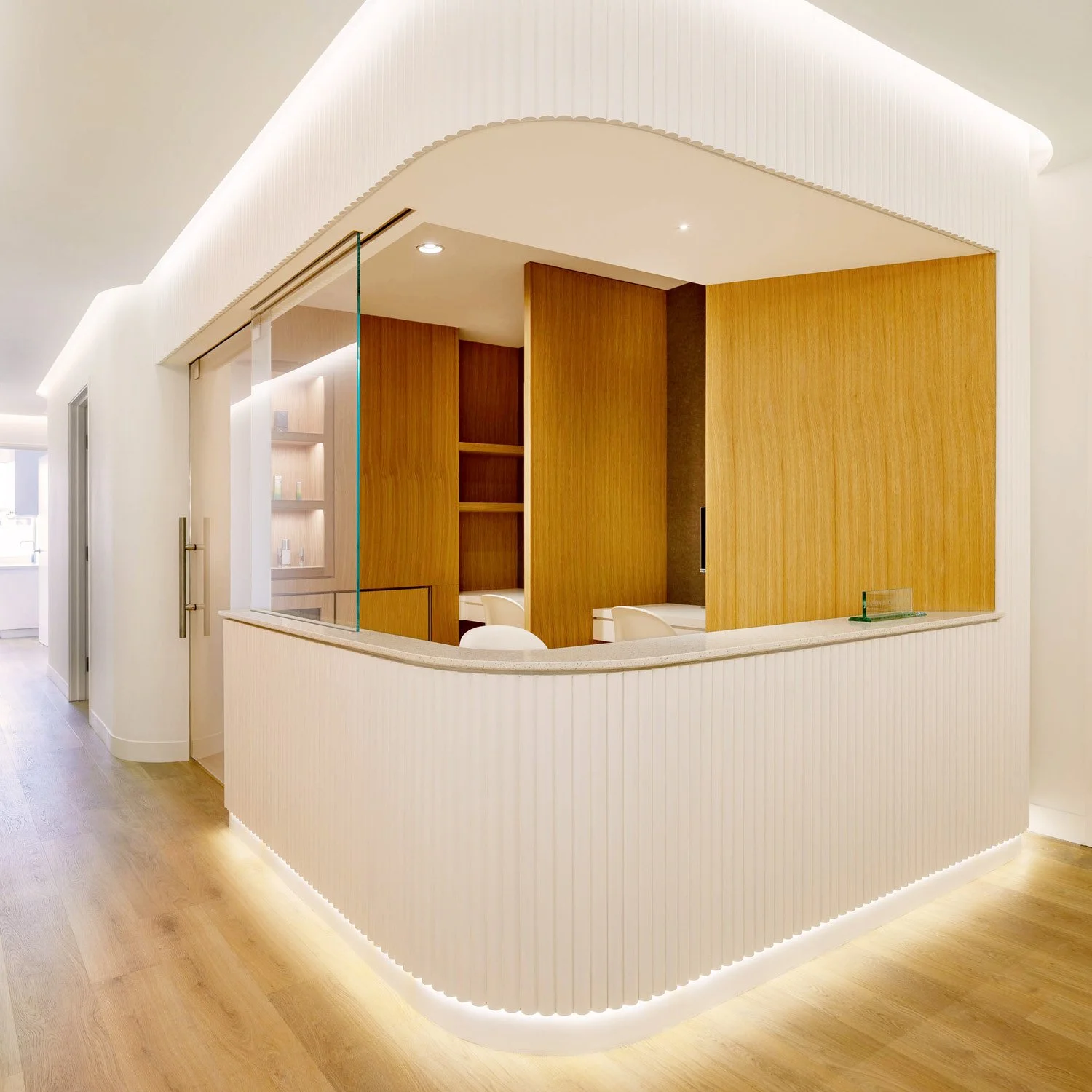 The material palette is intentionally restrained: white curving walls, natural white oak paneling, and white quartzite stone. Glowing cove lights graze these surfaces, celebrating their texture and form. Hand-crafted details—a fluted reception desk face, a floating waiting bench—carry the curve motif into every touchpoint. Three accent lights punctuate the reception area with a playful warmth.